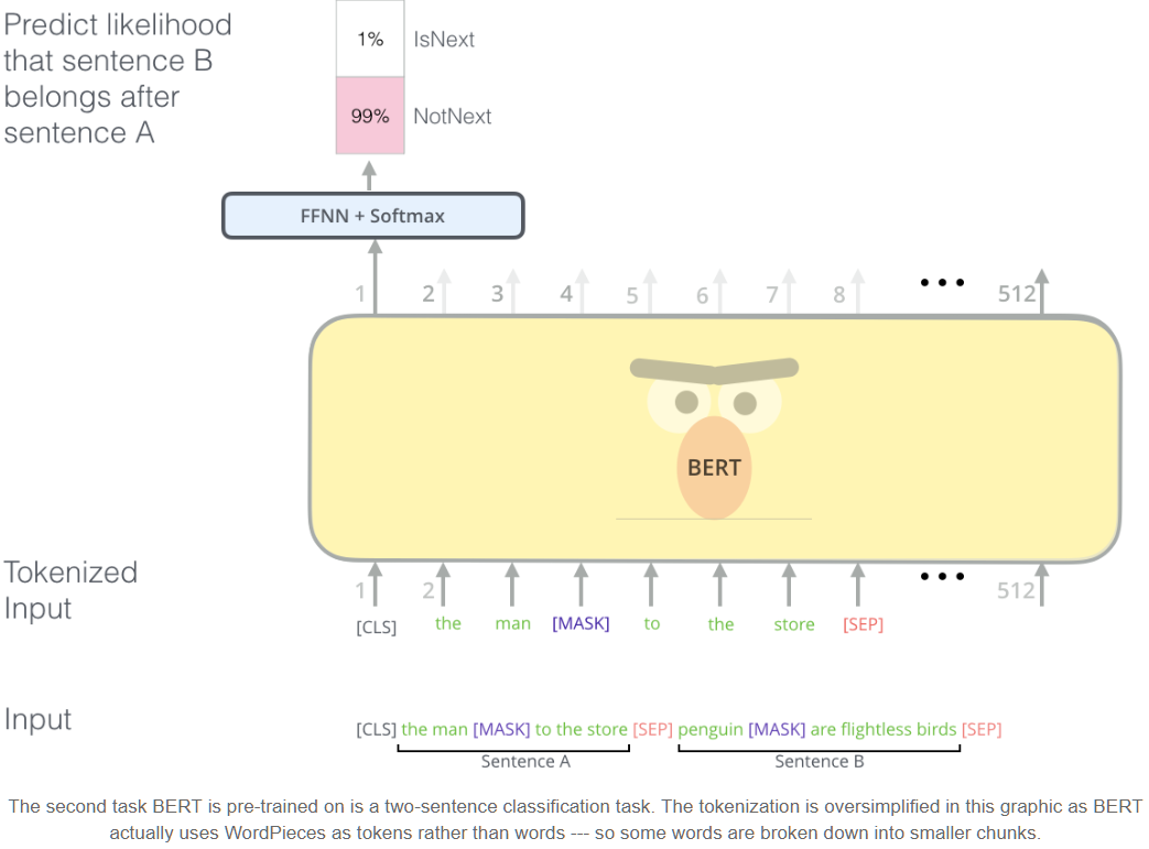 - predicting masked words = 15% of input sequence = not just the next word like ELMo/GPT